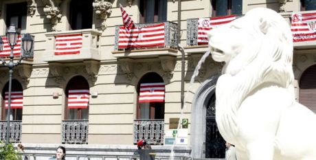 Hasta las instituciones más granadas y solemnes de la ciudad lucen en sus fachadas neoclásicas pendones y banderas. Choca ver paseantes ataviados con gafas rayadas en los colores de la camiseta (a 1,40 euros en Indautxu).